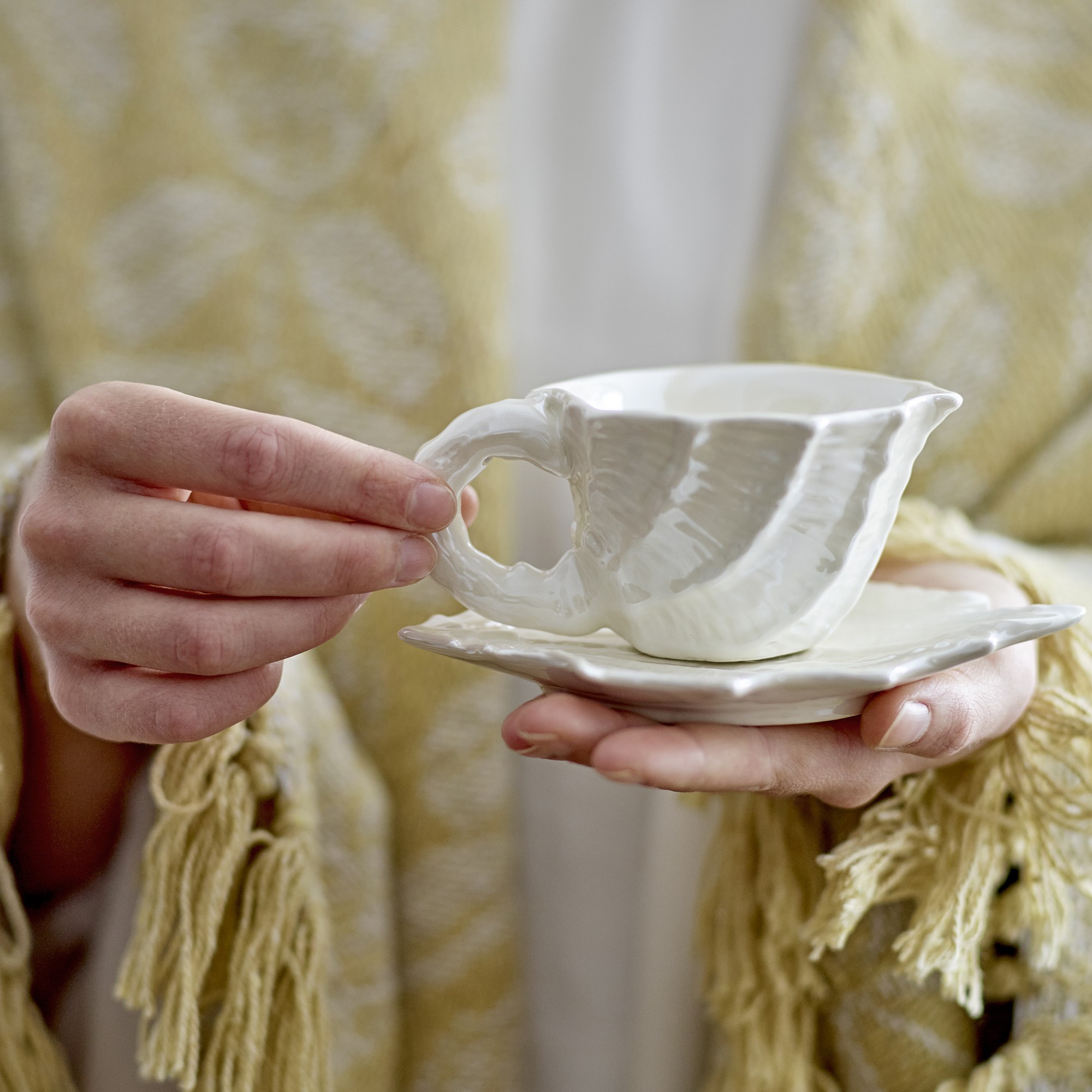 Die Form erinnert an Muscheln und der ungewöhnliche Henkel mit gedrehten Linien sowie die gewellte Untertasse unterstreichen diesen Eindruck.