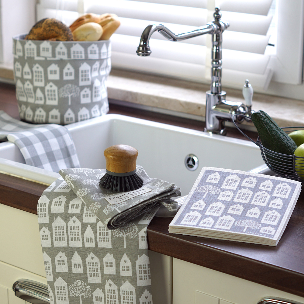 Entzückender Brotkorb aus Baumwolle in grau mit weißen Häuschen.