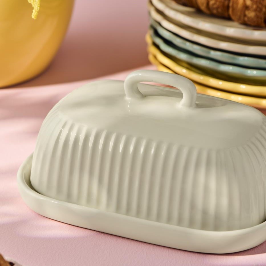 Große Butterdose aus Steingut in Butter Cream. Praktisch, für ein bisschen Nostalgie auf dem Frühstückstisch und perfekt um die Mynte Familie auf dem Tisch zu ergänzen.