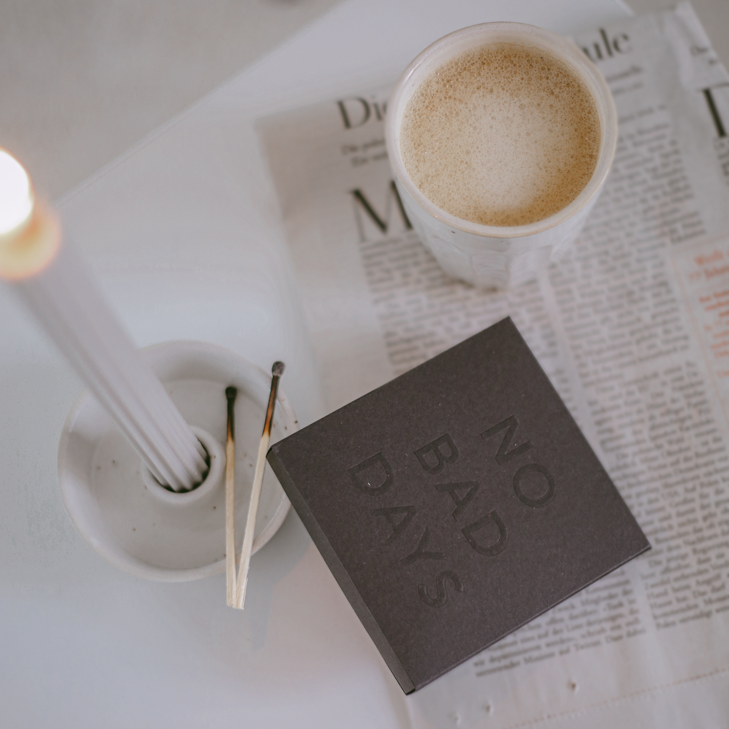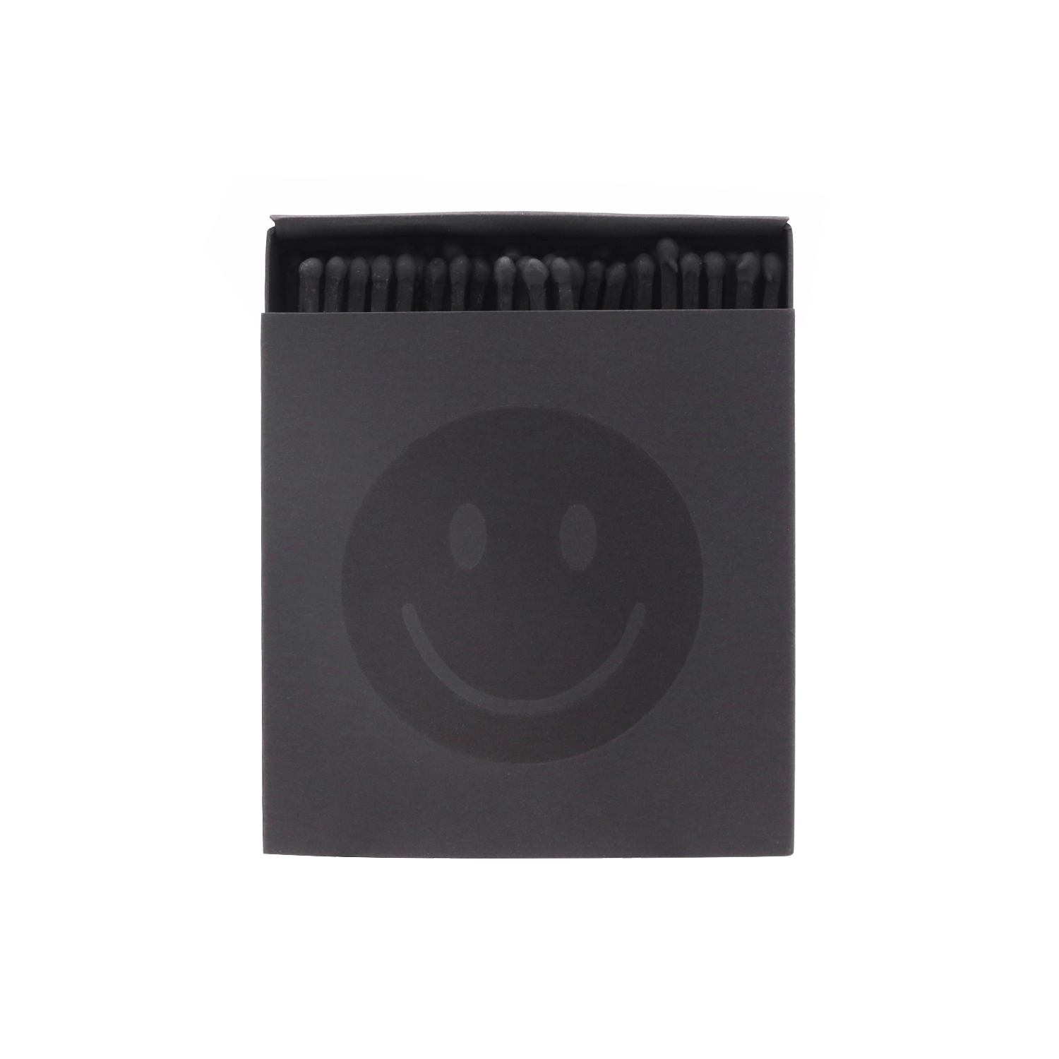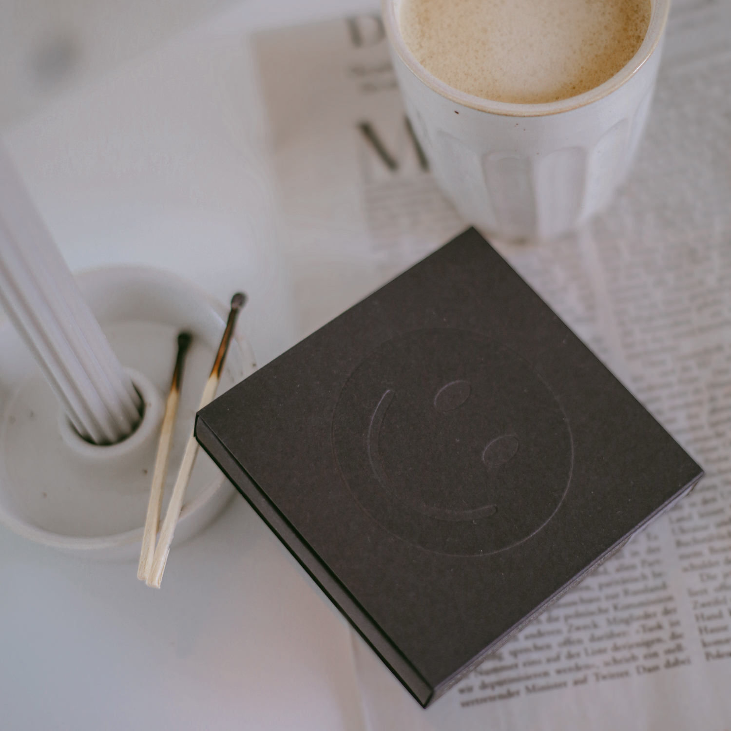 Schlechte Tage? Gibt es nicht! Und mit diesen Streichhölzern sowieso nicht mehr. Schwarze Schachtel mit Blindprägung, auf der einen Seite ein Smiley, auf der anderen "No bad days". Und der Clou: die Streichhölzer sind komplett schwarz.