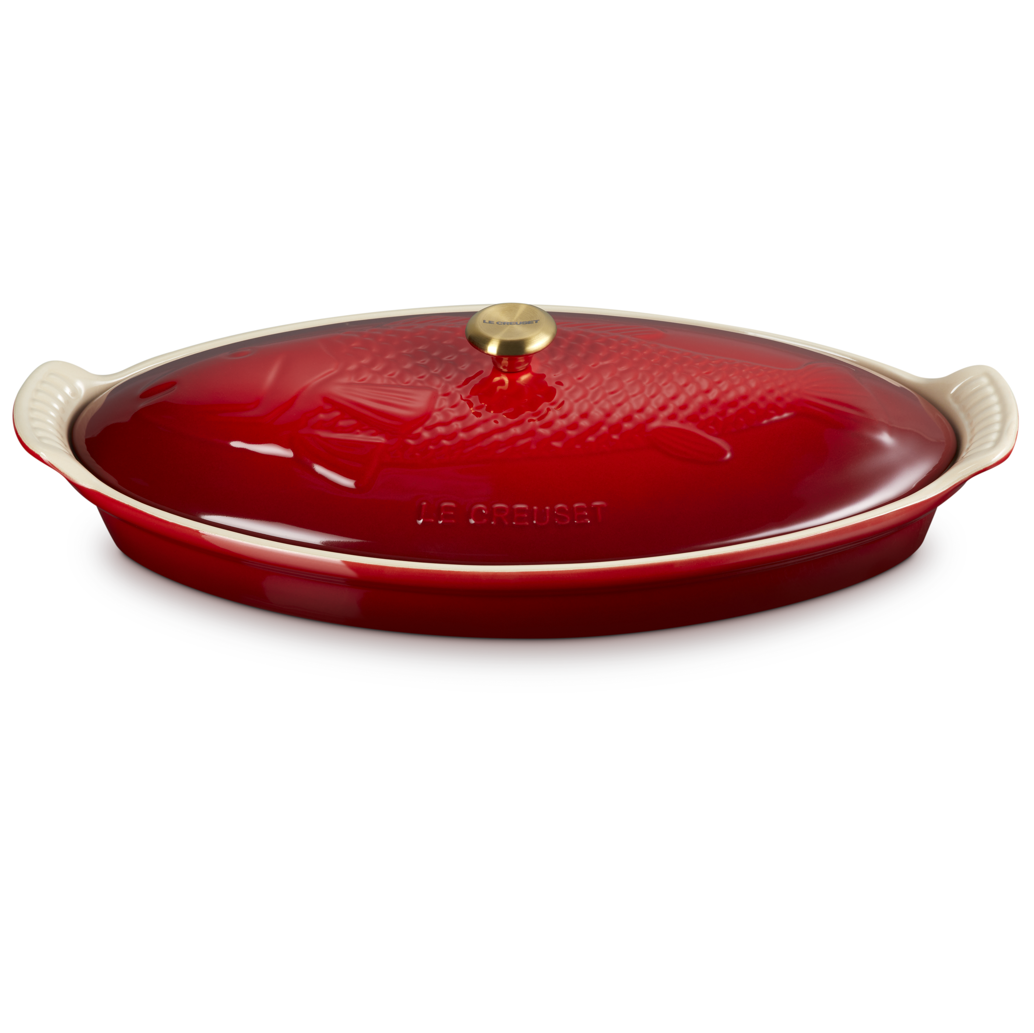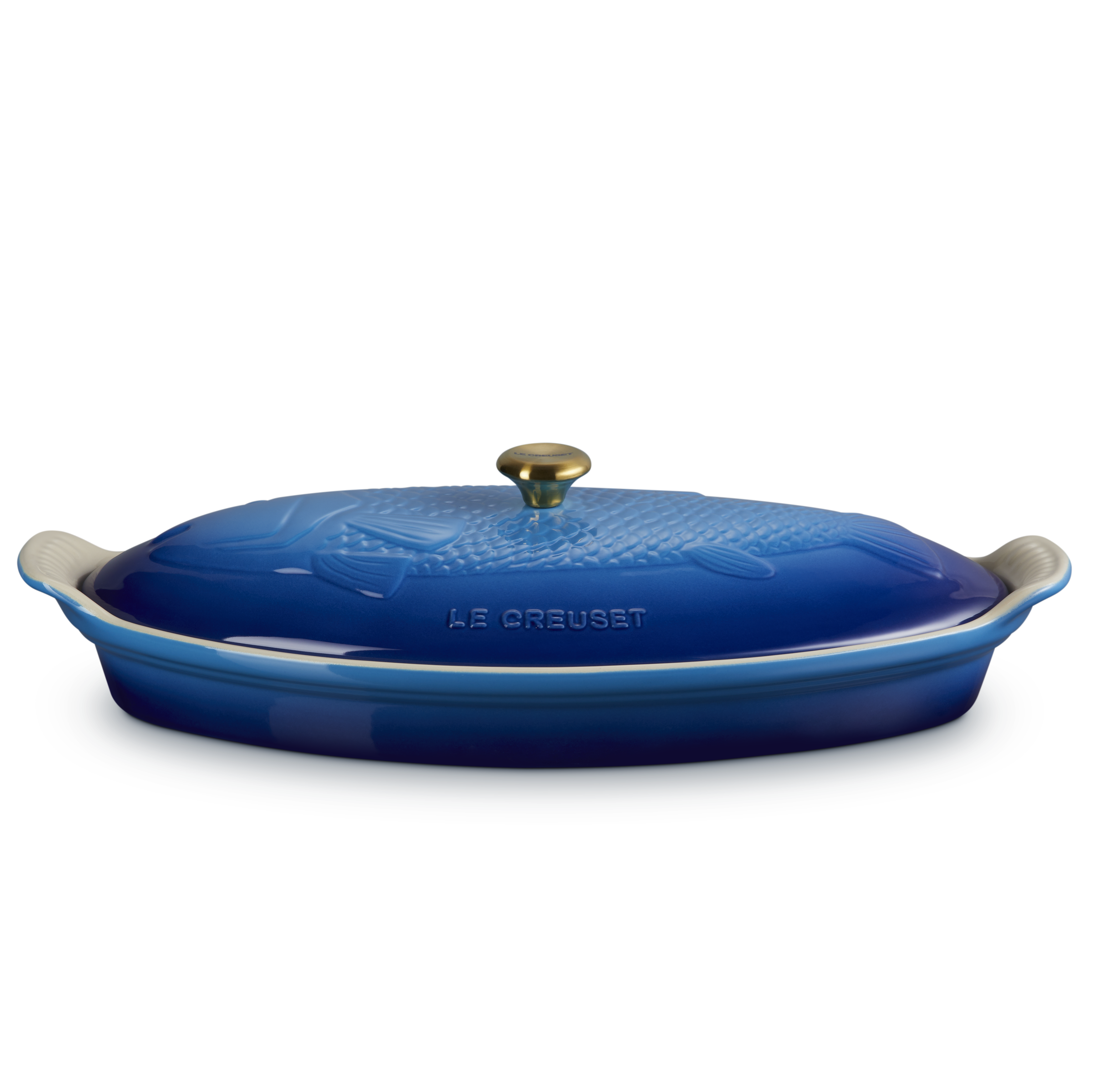 Diese ovale Fischbackform aus Steinzeug mit Deckel sieht wunderschön aus und ist mit dem eleganten Fischmotiv im Deckel auch auf dem Tisch ein echter Hingucker.