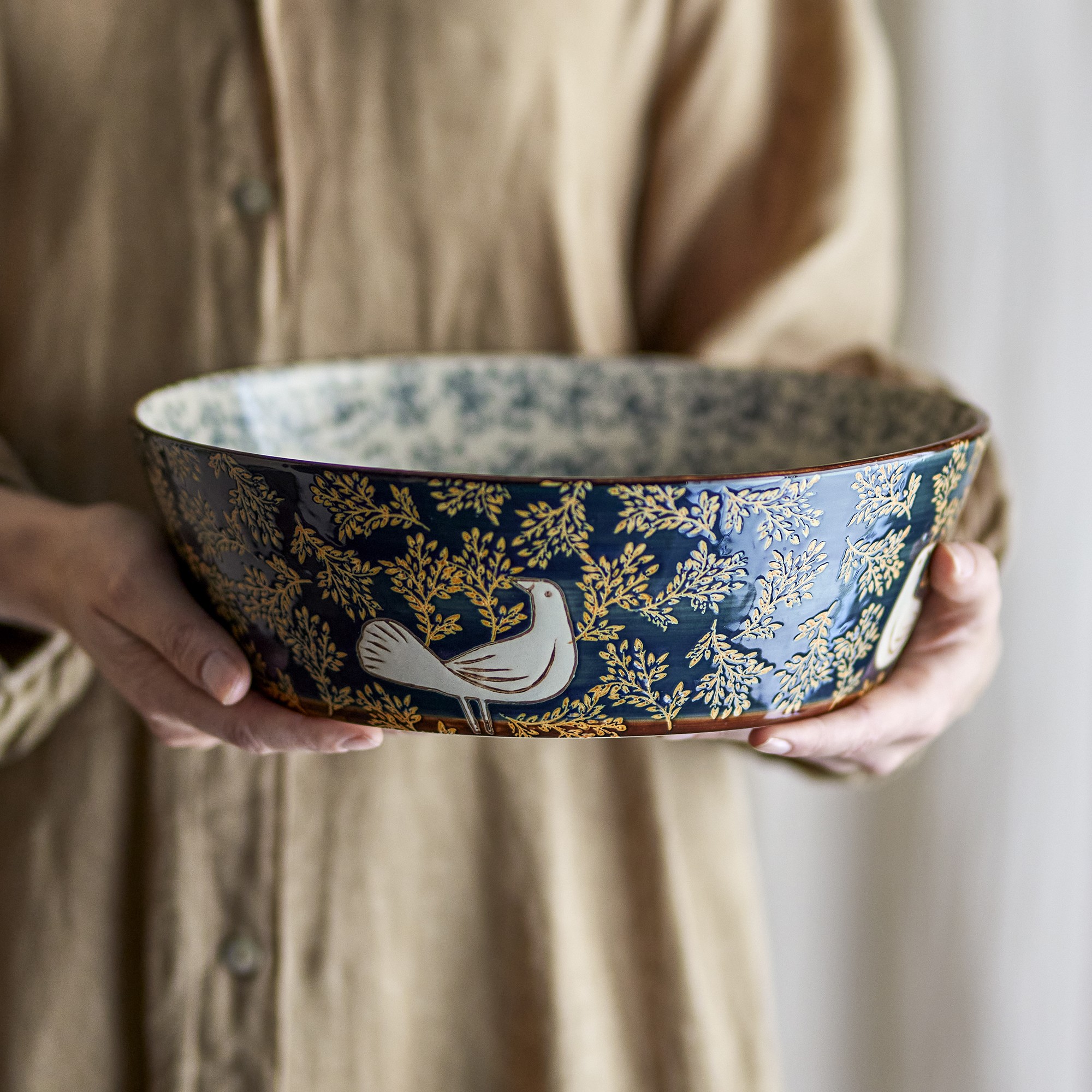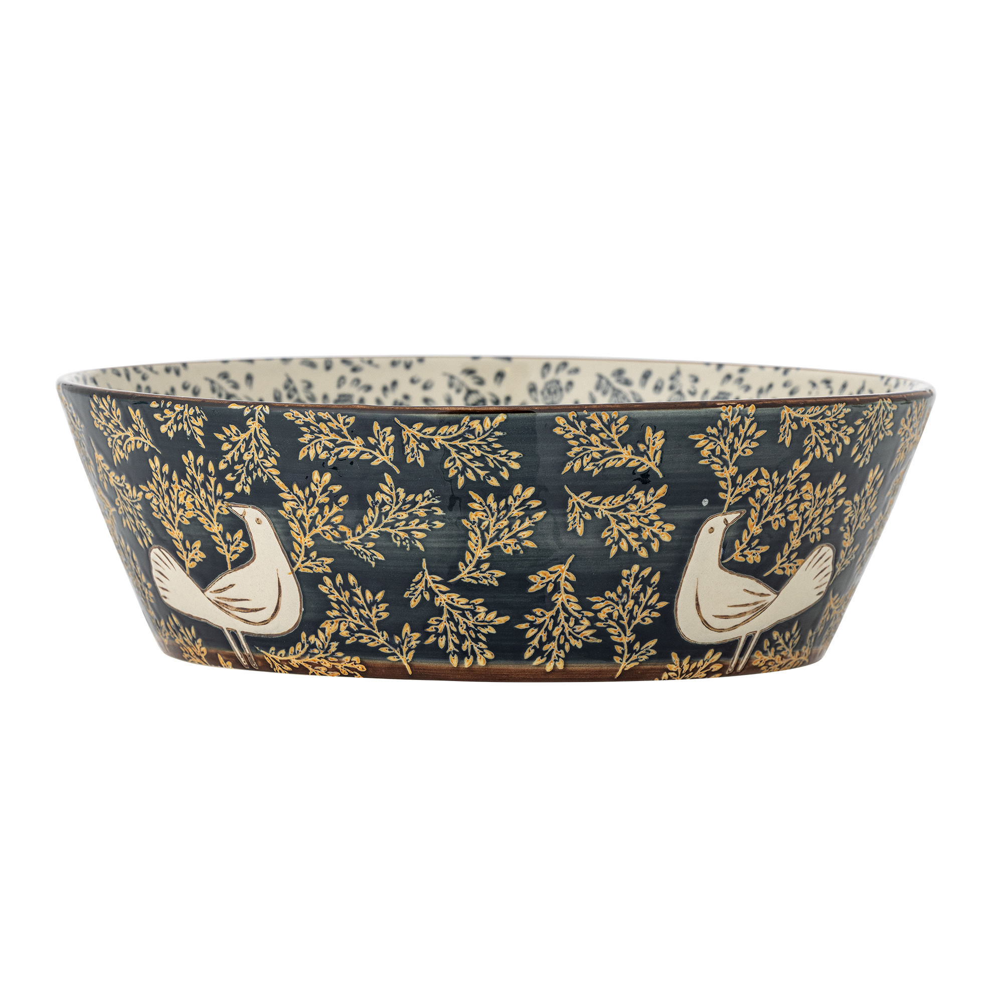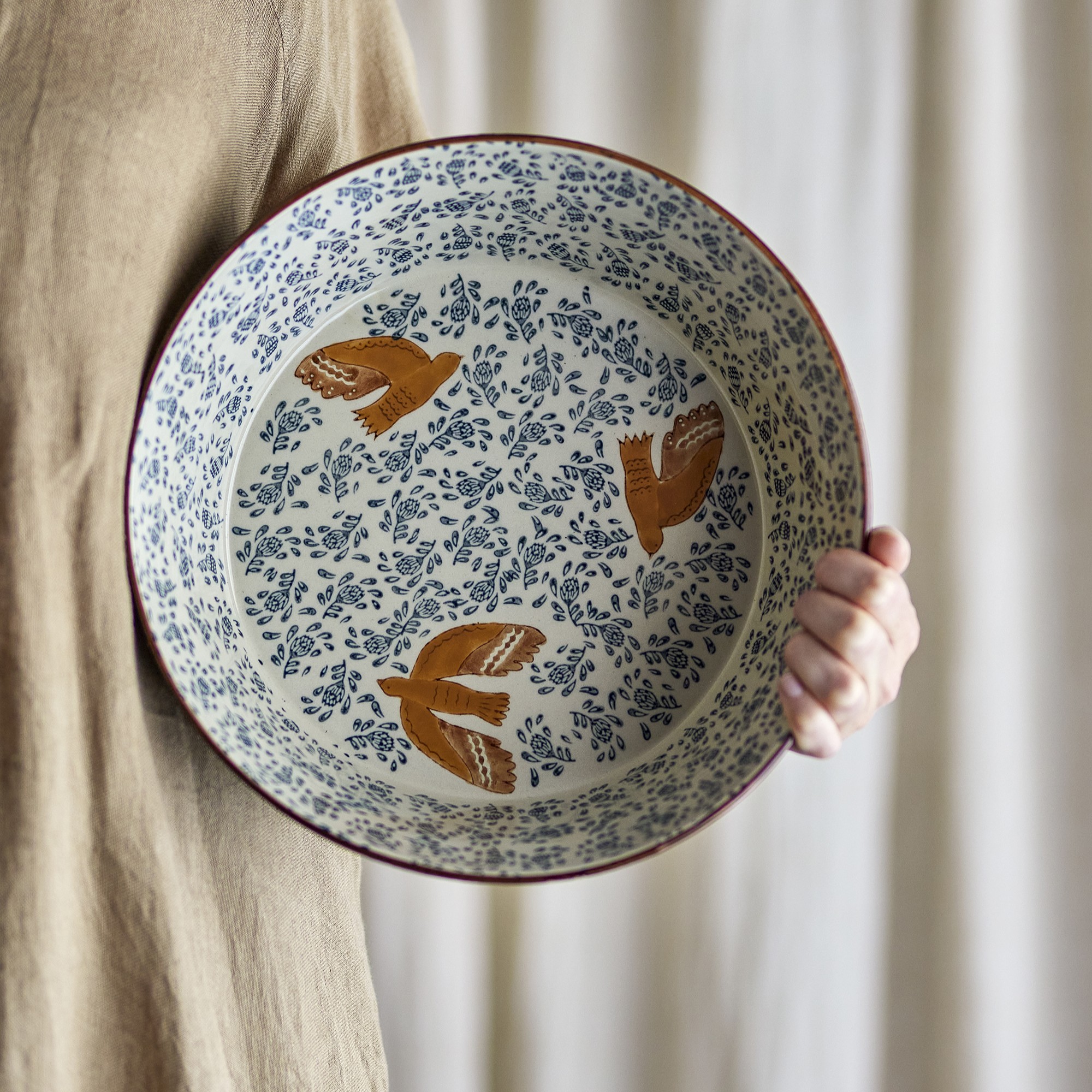 Die Hezha Steingut Schale von Bloomingville ist hat eine handbemalter Oberfläche, sowohl innen als auch außen ist mit Vögeln verziert. Sie hat kontrastreiche Details in sanften und auch kräftigen Tönen.
