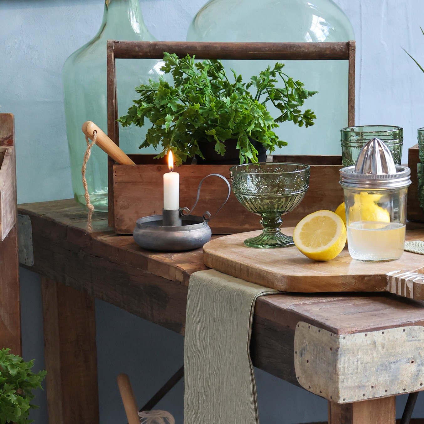 Kammerleuchte in antiker Zinkoptik und und schlichtem Stil mit etwas Platz für kleine Deko.