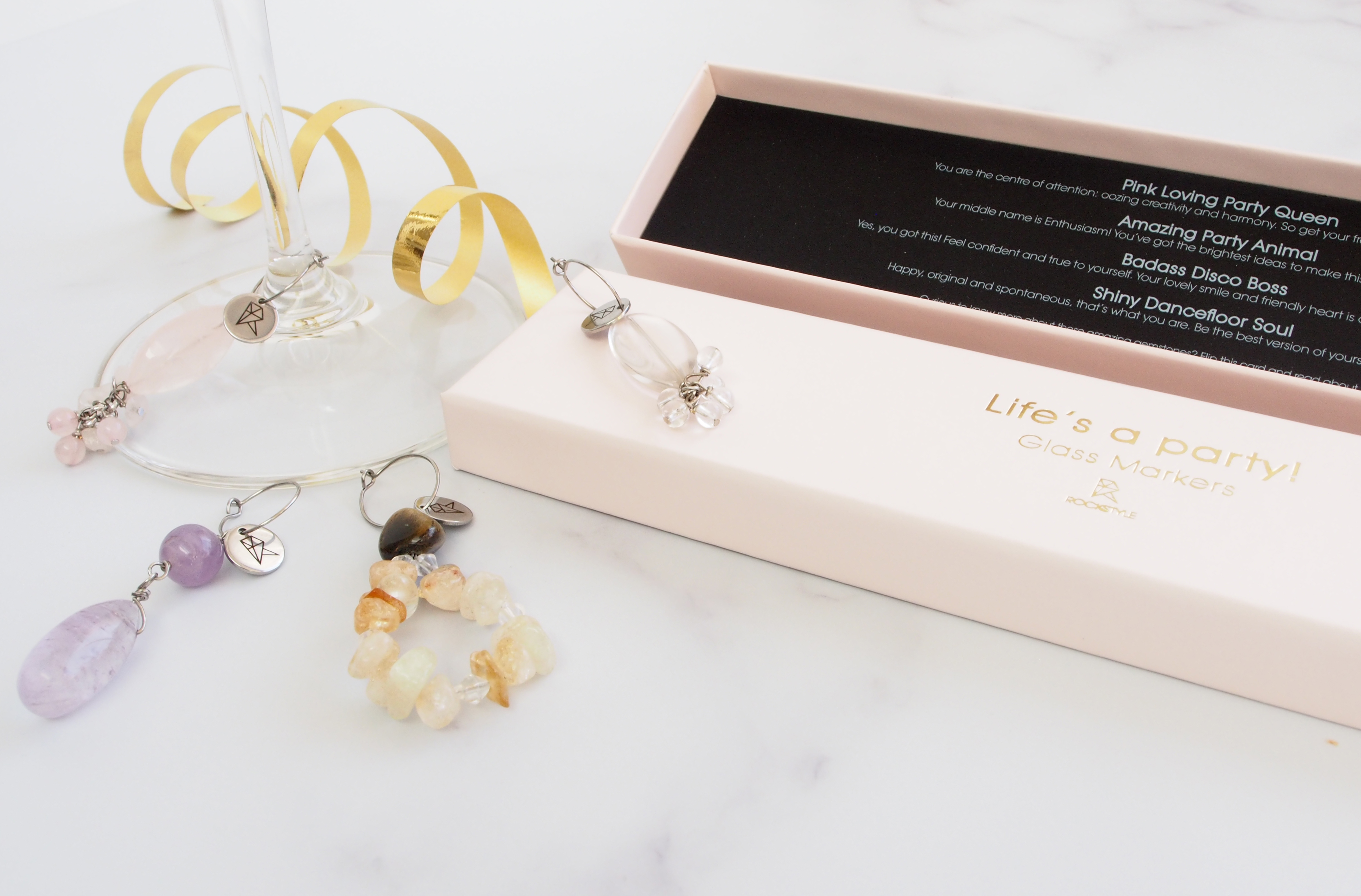 In einer schönen Geschenkbox sind 4 wine charms aus verschiedenen Steihen. Diese Glasmarker bestehen aus Silber, RVS und echten Edelsteinen. Kann leicht angegriffen und mit fließendem Wasser gereinigt werden. In der Geschenkbox finden Sie eine Karte mit Informationen über die Eigenschaften der Edelsteine.