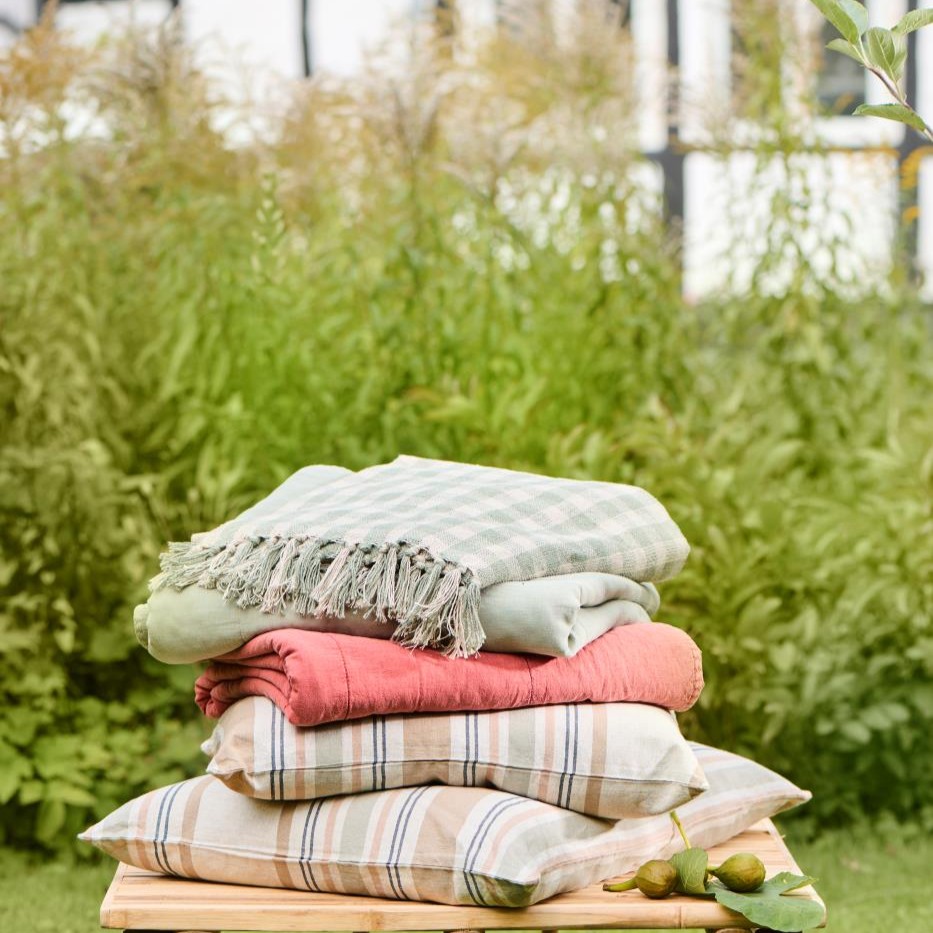 Plaid aus Baumwolle in einem zarten Natur mit staubgrünen Karos. Zauberhaft als Bettüberwurf oder auch leichte Decke in lauen Sommernächten. Eignet sich aber auch hervorragend als Tischdecke und selbstverständlich auch super als Picknickdecke.