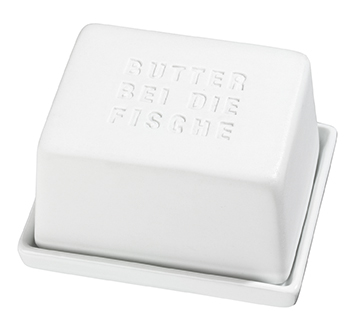 Diese kleine Butterdose von Räder ist mit einer Prägung "Butter bei die Fische" im Deckel versehen und hat auf der Butterschale innen kleine Fische.