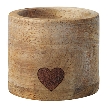 Eierbecher aus Holz mit aufgedrucktem Herz und Porzellanlöffel. Der Porzellanlöffel trägt die Aufschrift EIEIEI.
