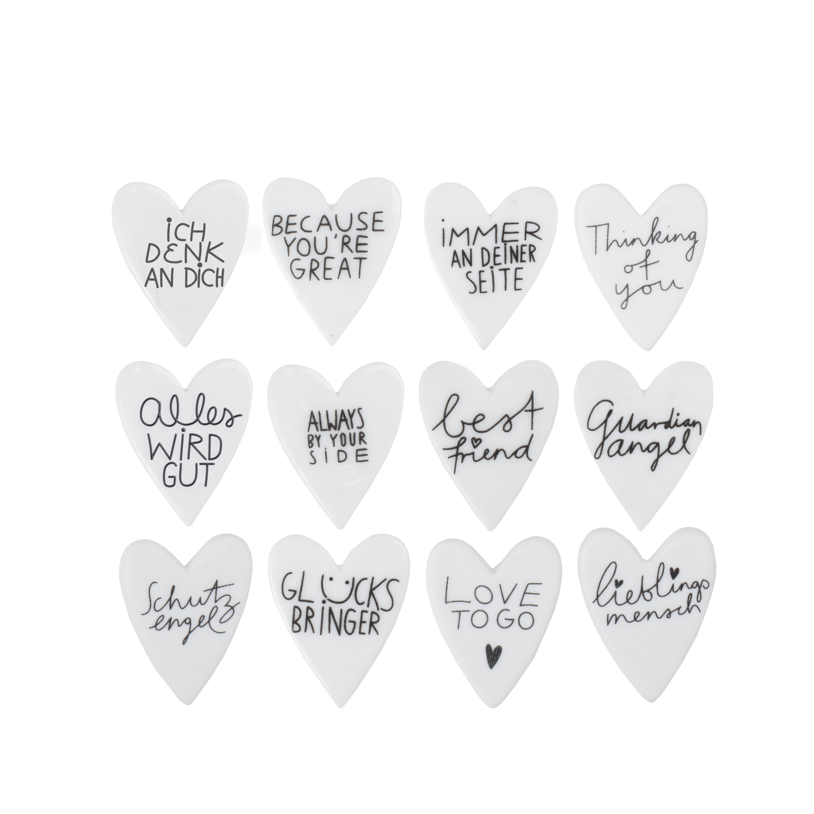 Kleine Porzellan Herzchen von Räder mit verschiedenen Sprüchen:- Love to go- Schutzengel- Immer an deiner Seite- Best Friend- Guardian Angel- Thinking of you- Glücksbringer- Because you`re great- Alles wird gut- Ich denk an dich- Lieblingsmensch- Always by your sideZuckersüß als Tischdeko oder einfach als kleine Liebesbotschaft für die Liebsten. Maße: 2 x 2,5 x 0,2 cm