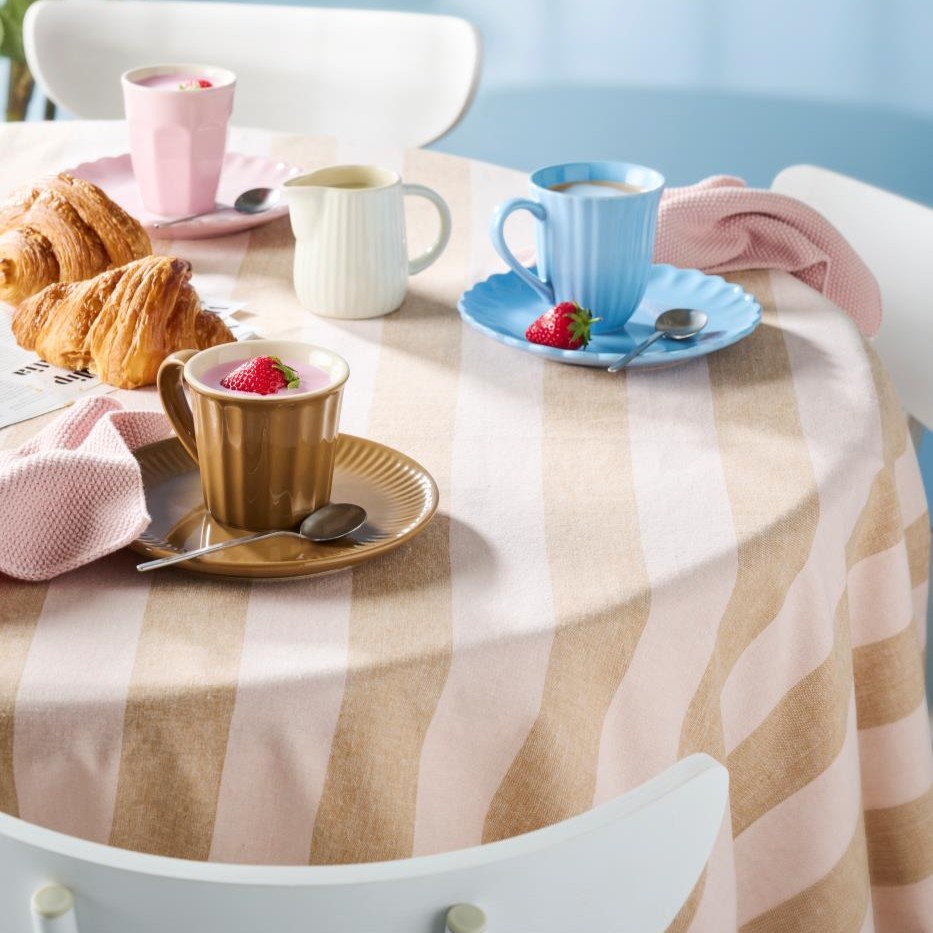 Baumwolltischdecke mit breiten Streifen und Hellbraun und Rosa, für einen modernen Look, der jedem Tisch Wärme und Struktur verleiht.