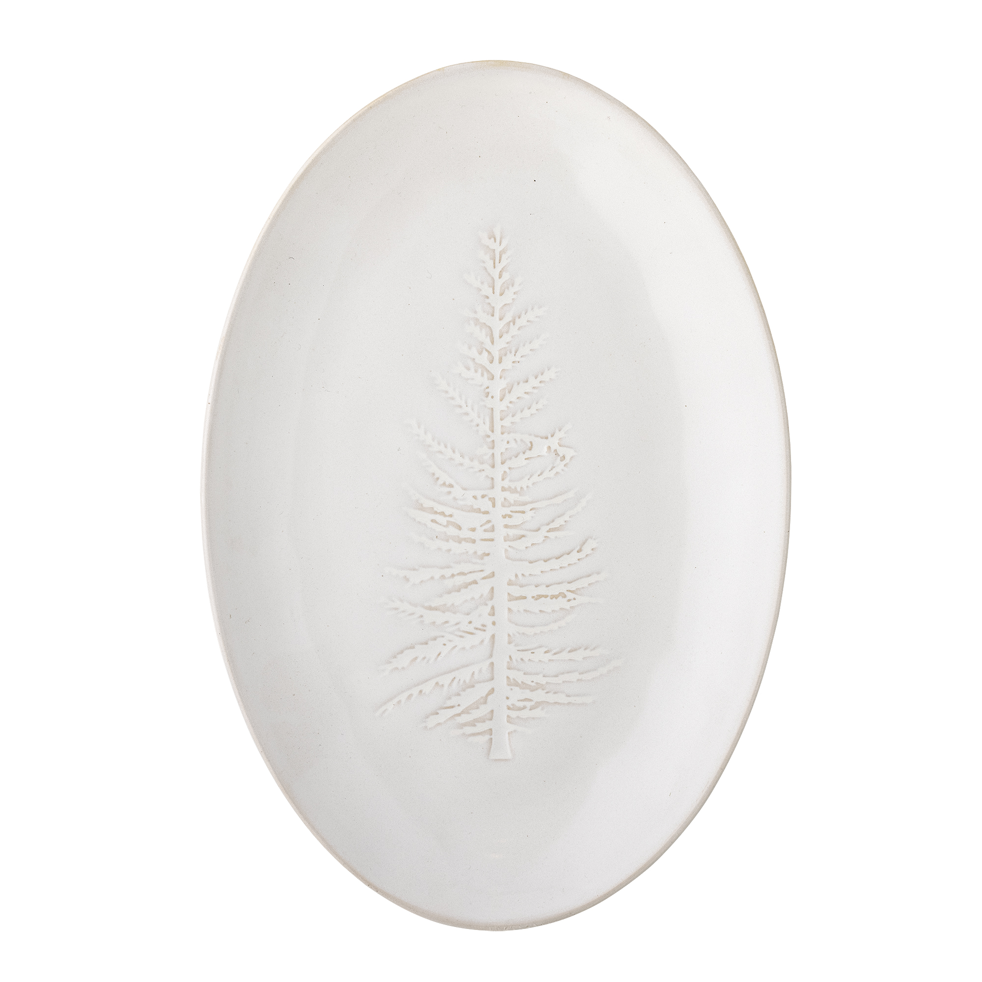 Gefertigt aus Steingut in hellen Farbtönen hat diese ovale Servierplatte ein geprägtes Muster, inspiriert von der Natur des Winters. Aufgrund der Beschaffenheit der Glasur können Farbvariationen auftreten, die jede Platte zu etwas ganz Besonderem machen.